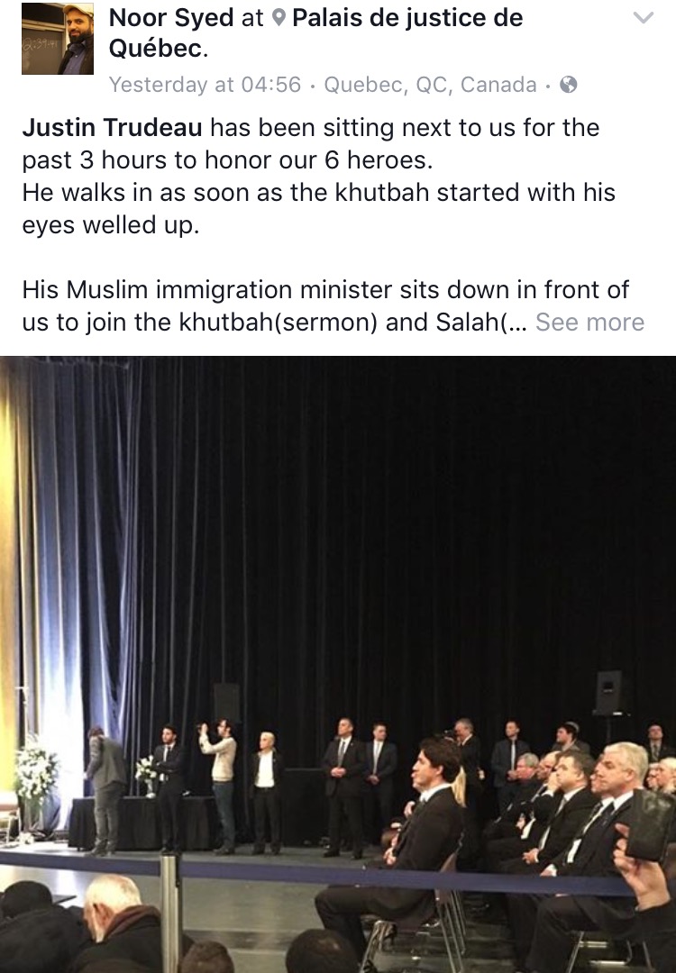 At the funeral prayer and gathering of the 6 Muslims killed, the Prime Minister was present throughout and his sympathetic acts during his stay were noticed by many, including Noor Syed, who’s Facebook post went viral.